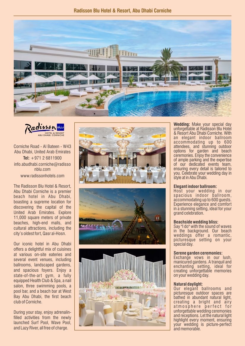 Wedding: Make your special day unforgettable at Radisson Blu Hotel & Resort Abu Dhabi Corniche. With an elegant indoor ballroom accommodating up to 600 attendees, and stunning outdoor options for garden and beach ceremonies. Enjoy the convenience of ample parking and the expertise of our dedicated events team, ensuring every detail is tailored to you. Celebrate your wedding day in style at in Abu Dhabi.
