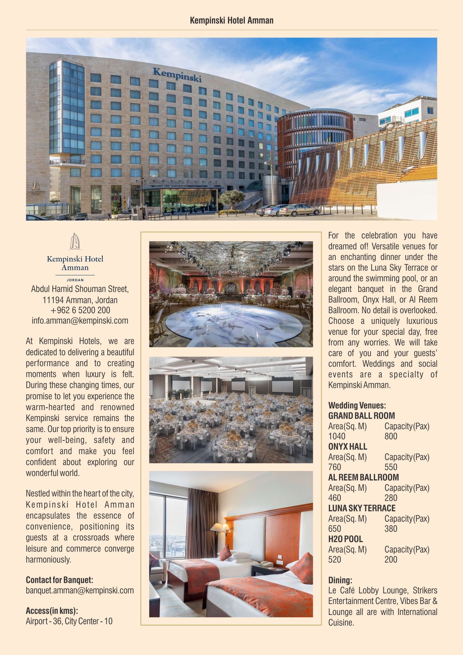 For the celebration you have dreamed of! Versatile venues for an enchanting dinner under the stars on the Luna Sky Terrace or around the swimming pool, or an elegant banquet in the Grand Ballroom, Onyx Hall, or Al Reem Ballroom. No detail is overlooked. Choose a uniquely luxurious venue for your special day, free from any worries. We will take care of you and your guests’ comfort. Weddings and social events are a specialty of Kempinski Amman.