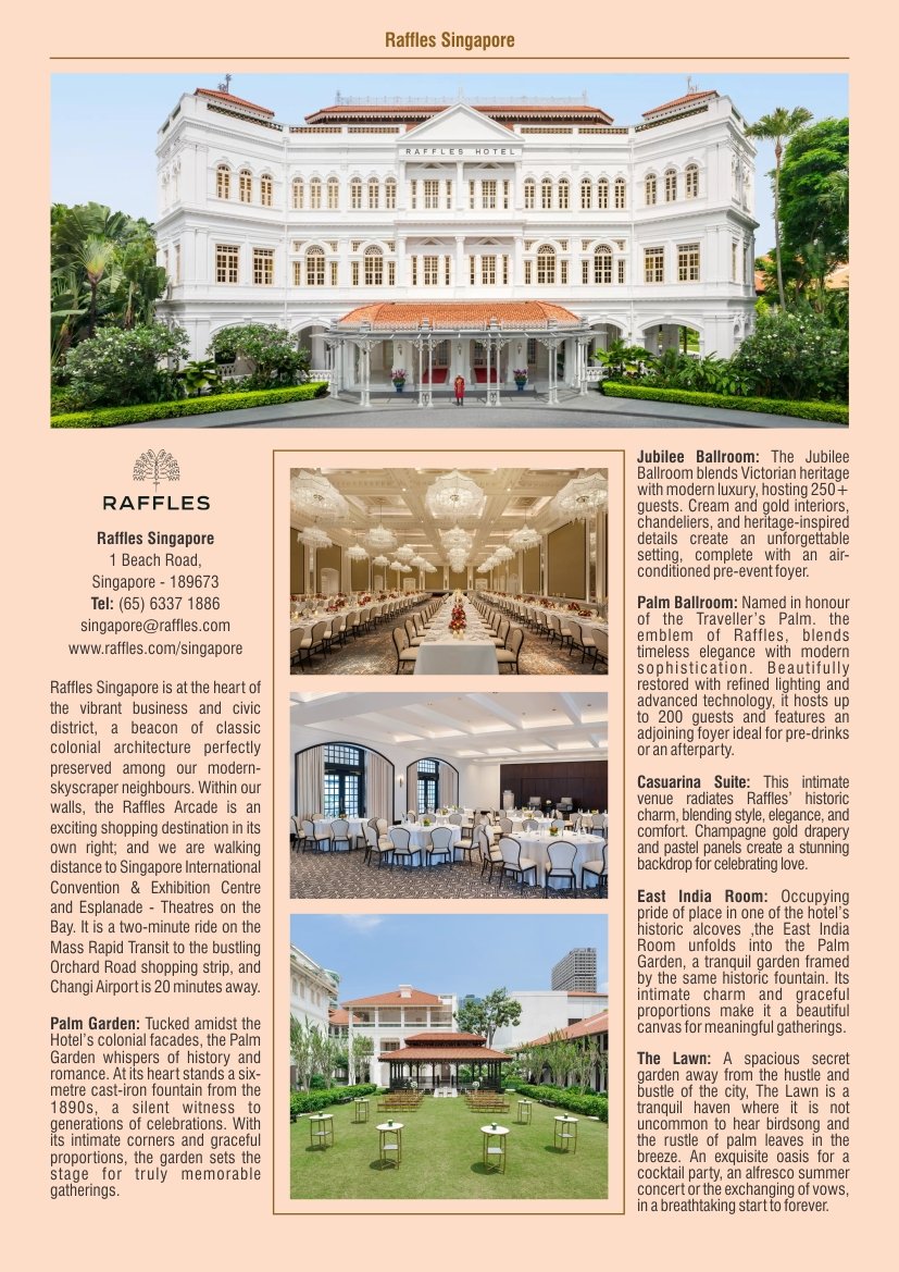Palm Ballroom: Named in honour of the Traveller’s Palm. the emblem of Raffles, blends timeless elegance with modern sophistication. Beautifully restored with refined lighting and advanced technology, it hosts up to 200 guests and features an adjoining foyer ideal for pre-drinks or an afterparty.